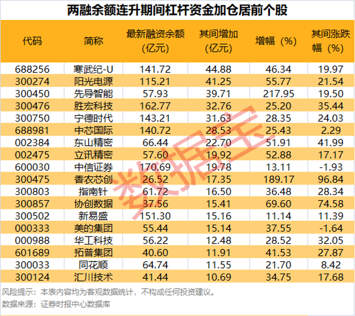 从绝对金额统计翻倍赚,两融余额连升期间,融资余额增加10亿元以上的有18股。融资余额增加最多的是寒武纪-U,其间融资余额累计增加44.88亿元,增幅为46.34%;阳光电源、先导智能融资余额分别增加41.25亿元、39.71亿元,位居第二、第三。